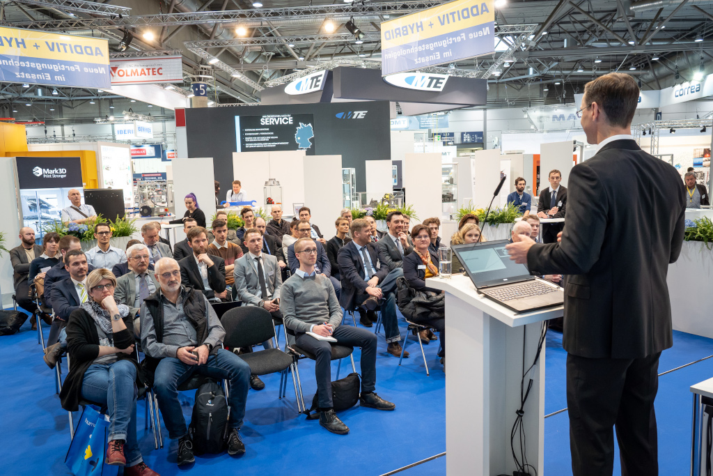 Der dynamische Prozess der Integration der Additiven Fertigung in die industrielle Produktion steht im Fokus der Sonderschau und des Fachforums „Additive Fertigung – Evolution einer modernen Technologie“. Ausgestellte Exponate werden auf einer Sonderfläche zum Anziehungspunkt in der Messehalle – daran beteiligen sich unter anderem die Aussteller 3D-Metall Theobald, METROM Mechatronische Maschinen und TRUMPF Laser- und Systemtechnik.