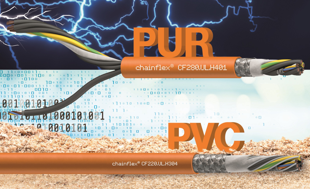 PUR weist dagegen eine besonders hohe Kerbzähigkeit und Ölbeständigkeit auf. Dadurch eignen sich die halogenfreien PUR-Leitungen beim Einsatz in der Energiekette vor allem bei sehr hoher Ölbelastung, zum Beispiel in einer Werkzeugmaschine. Hinzu kommt ein erweiterter Temperaturbereich von -25°C bis +80°C. Die chainflex Leitungen sind sowohl als Meterware als auch konfektioniert ab Lager verfügbar und passend zu den bekannten Herstellerstandards konstruiert.