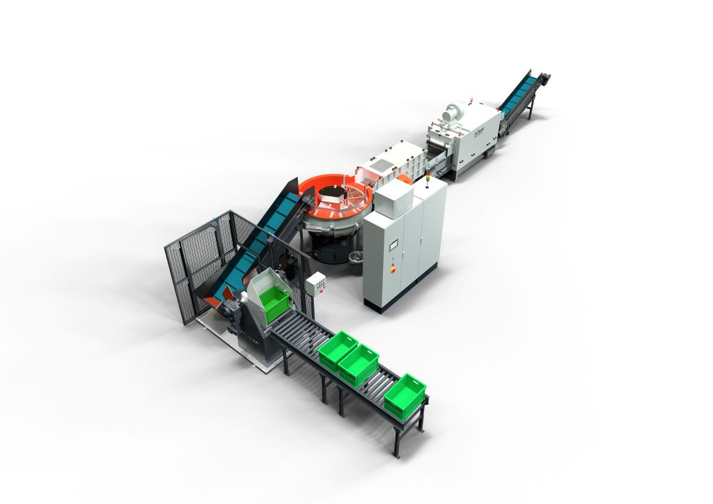 Die Anlagenverkettung von Rösler besteht aus sechs Einheiten: Über eine Rollenbahn werden die Werkstückkisten mittels Kippgerät zur Beschickung transportiert und über diese aufs Zuführband gegeben. Dort wird vom Anlagenbediener, je nach Größe und Geometrie des Bauteils, das entsprechende Bearbeitungsprogramm gewählt. Anschließend werden die Steckverbinder-Gehäuse vom Zuführband automatisch in einen Rundvibrator dosiert und dort in einem Prozessschritt entgratet sowie entfettet. Nach Ende der definierten Bearbeitungszeit beginnt die Maschine mit der automatischen Entleerung des Rundvibrators und über ein Maschensieb erfolgt die Separierung der Teile vom Schleifmedium. Anschließend werden diese auf einer Vibrationswaschanlage mit Wasser-Compoundgemisch abgesprüht und mit getrennter Prozesswasserführung nachgereinigt, bevor sie in einer automatischen Durchlauftrocknung getrocknet werden. Danach gelangen die Teile über ein Transportband in die kundenseitigen Transportbehältnisse. Bis auf wenige Ausnahmen, wie die Wahl des Bearbeitungsprogramms, läuft der Prozess komplett ohne die Unterstützung des Bedienpersonals ab.