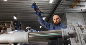 HandySCAN MAX: Entwickelt für große Bauteile und raue Umgebungen, bietet dieser Scanner hohe Genauigkeit und Mobilität. Ideal für Anwendungen in der Luft- und Raumfahrt, Automobilindustrie und Schwerindustrie wie die Inspektion von Turbinenschaufeln und das Reverse Engineering großer Gussteile.