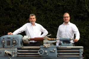 v.l.n.r. die beiden Geschäftsführer der Röder Maschinenbau GmbH Erwin Röder und Tobias Röder. Tobias Röder: „Ein besonderes Highlight unseres neuen CNC-Profilfräszentrums ist der automatische Werkzeugwechsel des Winkelkopfes – und zwar inklusive automatischer Werkzeugwechselfunktion.“ Bild: Röder