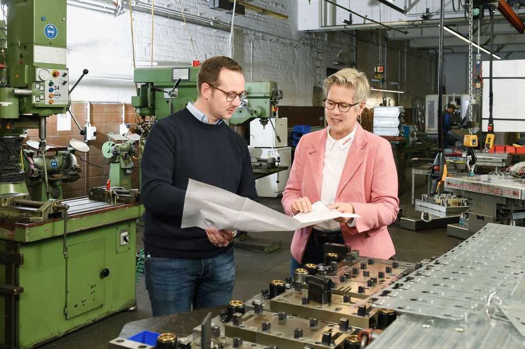 Stephan Kortenbrede (links), Leiter des Betriebsmittelbaus bei Winkhaus, und Susanne Hecke-Fiss, Kundenberaterin Umformung bei Oerlikon Balzers. / Foto: Oerlikon Balzers