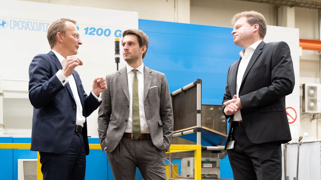 Flender-CEO Andreas Evertz (links) und Flender-Produktionsleiter Christian Weck (rechts) zeigten NRW-Staatssekretär Paul Höller die Teilefertigung am Standort Bocholt. Bild: Flender