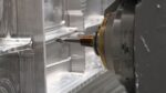 Auch ein für Strukturbauteile typischer, sogenannter T-Stiffener zur Aussteifung, ist am Musterteil vorhanden und wird mit einem PKD-Sonderwerkzeug bearbeitet. Auch Bohr- und Reiboperationen sind in bestimmten Bereichen verlangt. „An unserem Bauteil ist nichts normal“, kommentiert Dominik Merz den Umstand, dass praktisch nirgendwo ein rechter Winkel zu finden ist. Solche schrägen Konstruktionen seien aber ganz typisch für den Aerospace-Bereich.