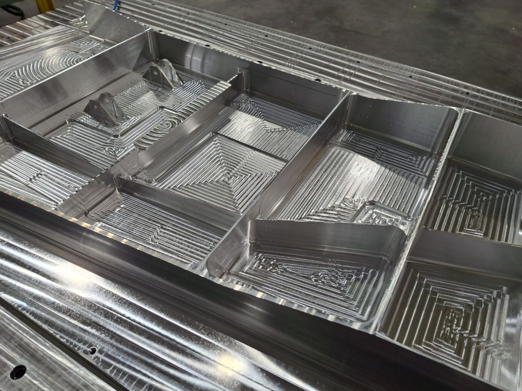 Die Bearbeitung fand in Baienfurt in zwei Aufspannungen statt. Setup 1 erfolgte in Niederzugspannung, im Setup 2 sorgte Vakuumtechnik für sicheren Halt. Die Vorderseite sieht auf den ersten Blick einfacher aus als sie tatsächlich ist. Die Fläche ist nicht eben, sondern biegt sich leicht konvex über einen Radius von 9,5 m. Damit kann man das Bauteil nicht einfach planfräsen, sondern muss Fünf-Achs-Bearbeitung nutzen. Zum Schruppen und Schlichten setzte MAPAL auf den NeoMill-Alu-QBig mit 50 mm Durchmesser und den OptiMill-Alu-Wave mit 25 mm Durchmesser. Das Oberflächenfinish führte ein PKD-Sonderfräser durch.