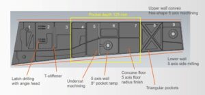 Besonders anspruchsvoll gestaltete sich die Bearbeitung der Rückseite, die in neun verschiedene Sektionen mit jeweils besonderen Applikationen untergliedert ist. Wie jedes Rear Spar weist das Musterbauteil viele Taschen auf, hier allerdings in allen erdenklichen Formen ausgestaltet: rechteckig, dreieckig, rund, offen, geschlossen, teilweise mit schrägem oder gewölbtem Boden. Die Stege sind sehr dünn, Wandungen überwiegend schräg. Die Taschen haben eine Tiefe von bis zu 137 mm.