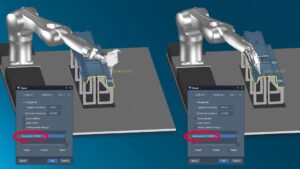 Robot-specifični sukobi poput singulariteta, krajnjih prekidača ili teških pozicionih područja sada se izravno identificiraju tijekom izračuna putanje alata. Svi sukobi vizualiziraju se u modelu i mogu se odmah interaktivno ispraviti.